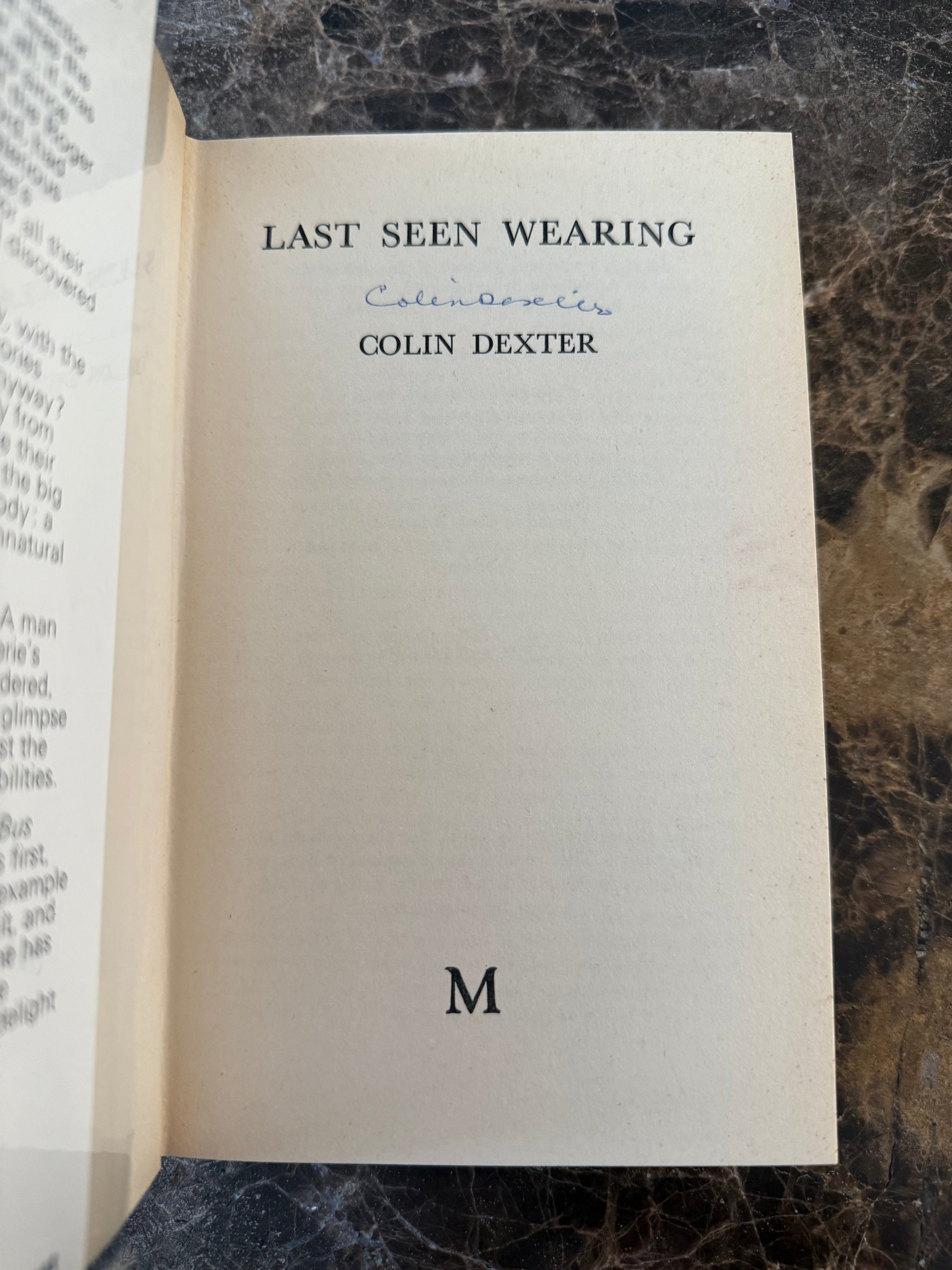 First edition of Last Seen Wearing, published by Macmillan in 1976, signed by Colin Dexter on the title page. The second book in the Morse series, following Last Bus to Woodstock, establishing the character and style that would define Dexter’s career.