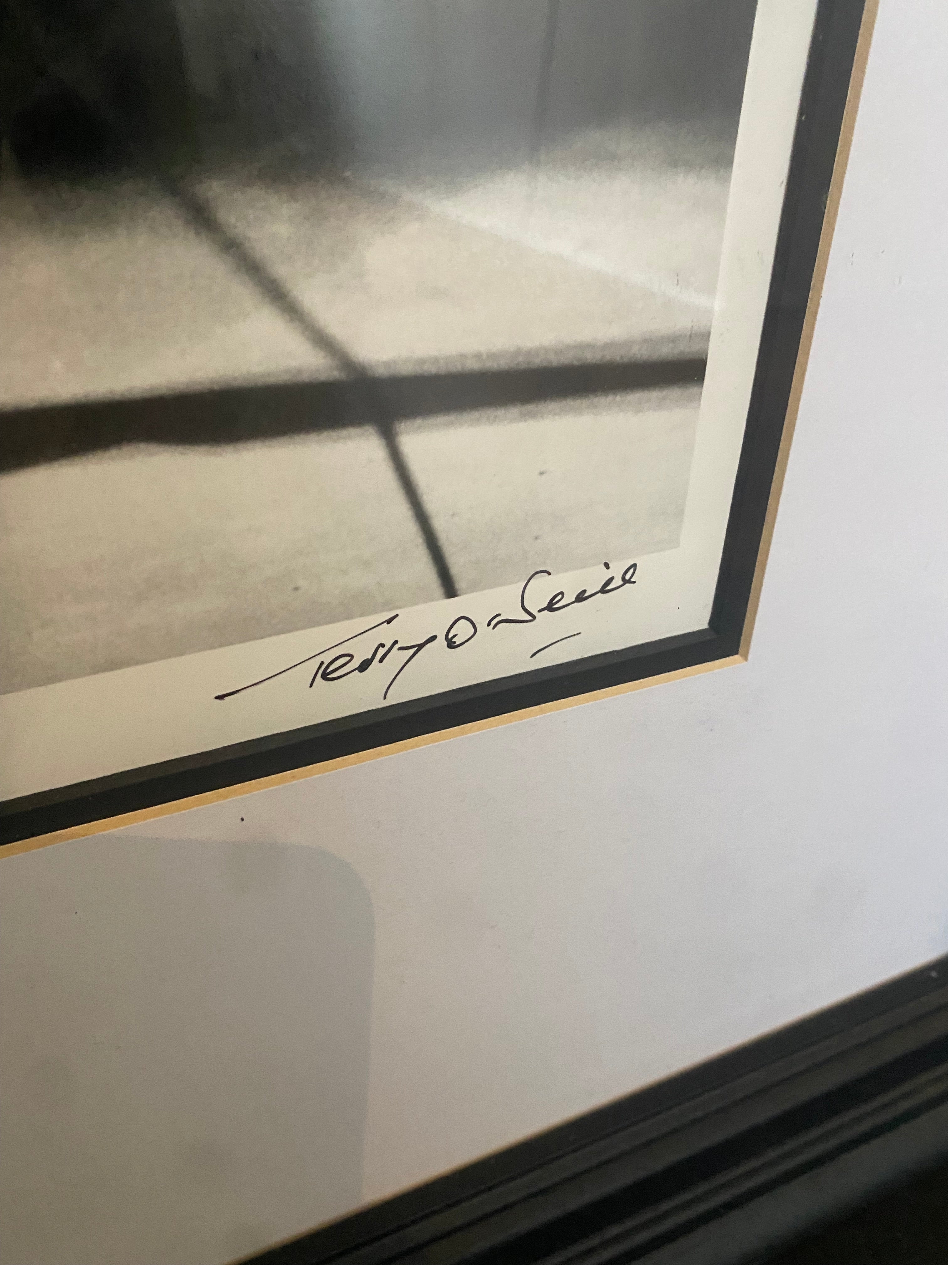 This is an original silver gelatin print by Terry O'Neill, signed and numbered in black ink by the photographer in the lower margin. The piece is framed and glazed, measuring approximately 20 inches by 24 inches (51 cm by 61 cm).