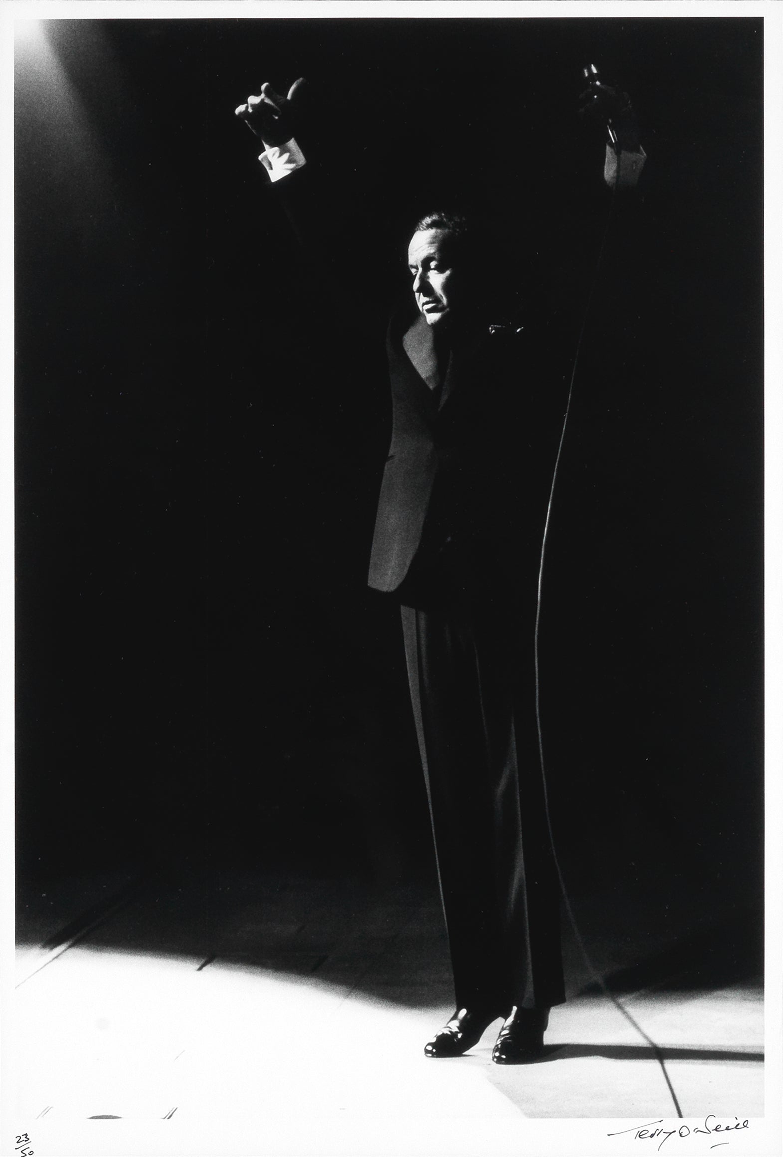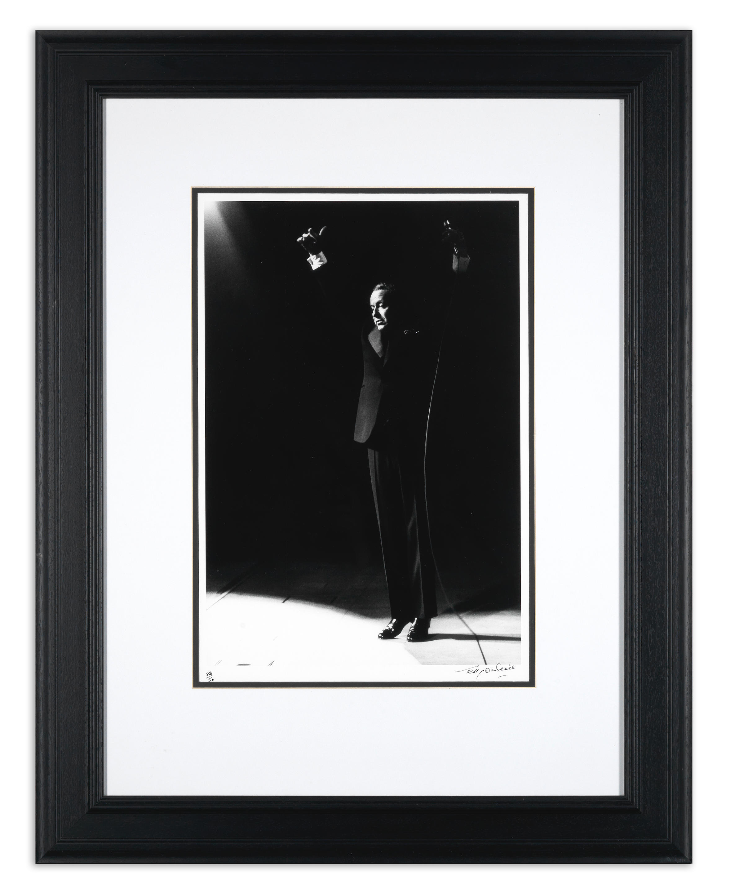 This large-scale original photograph captures the legendary Frank Sinatra performing on stage in London, taken by Terry O'Neill in an iconic shot. The composition is striking, featuring the silhouette of the microphone illuminated against a dark backdrop, enhanced by soft lighting from above. Sinatra's dynamic pose, with his arms raised high, encapsulates the energy of the performance, making this one of the most remarkable images I’ve encountered and a true highlight of Terry O'Neill's portfolio. I am thrilled to present this photograph for sale.