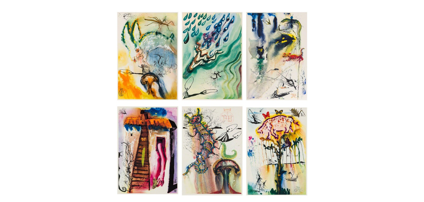 “Dalí’s images have become icons of the fantastic, signposts (not maps) that point the way inward to that realm” (Clute & Grant, 246). This magnificent production, printed on Mandeure paper, contains an original three-color etching as a frontispiece and 12 striking full-page color photogravures (heliogravures) after Dali’s original gouache paintings (Michler & Löpsinger).