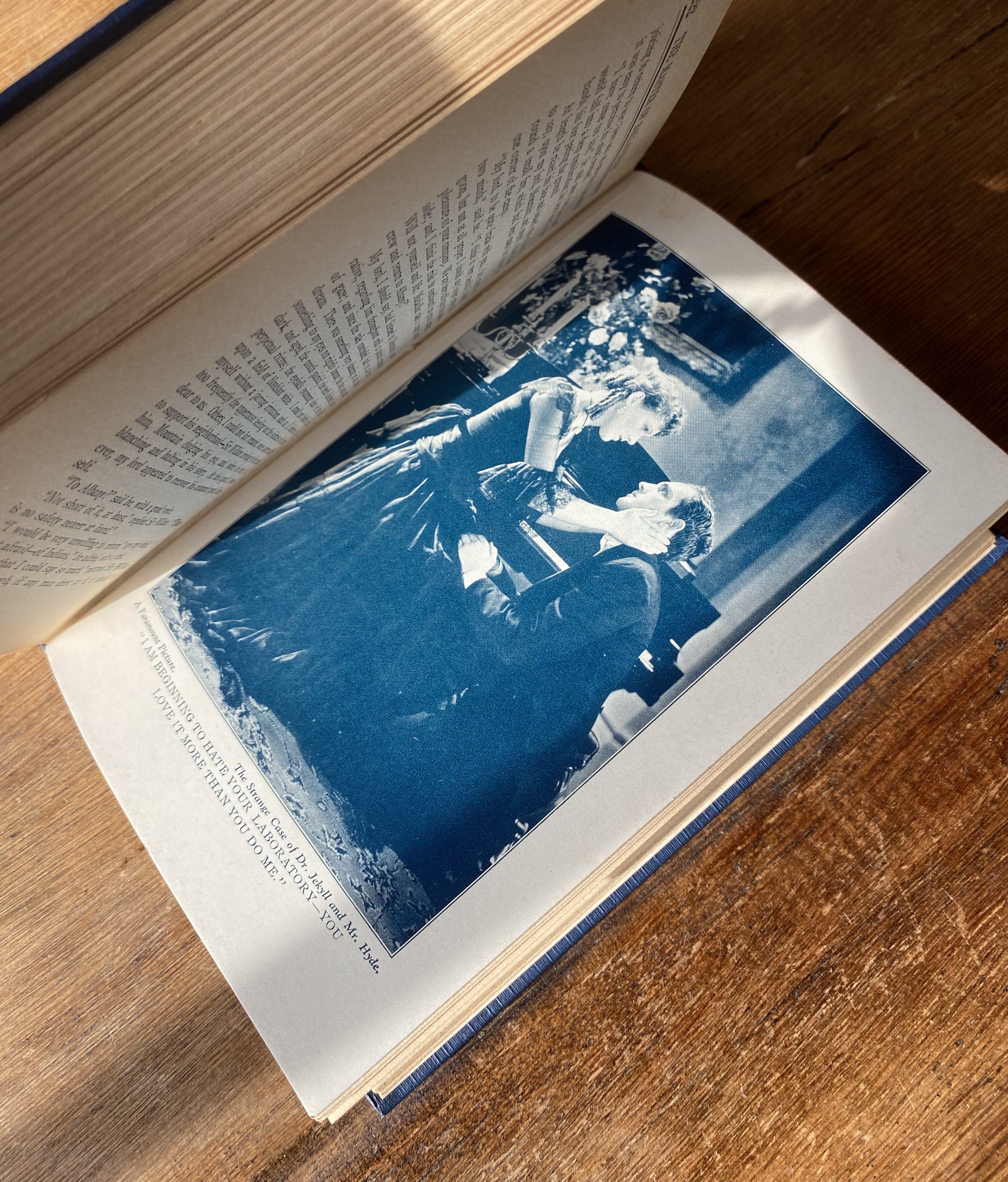 First edition, first impression, first state with the movie illustrations (the second state was published without the photoplay photographs but with the same pictorial dustjacket). A fine example internally, crisp white pages (quite remarkable really) and the original blue and red binding is near pristine. This example is complete with all requisite six plates (to include the frontispiece and the double-page illustration at page 30). The dustjacket is near fine with some nicks to the extremities. A seriously amazing example. The only defect to mention is a tape repair to the back of the DJ but this isn't noticeable from the front. A near fine to fine example.