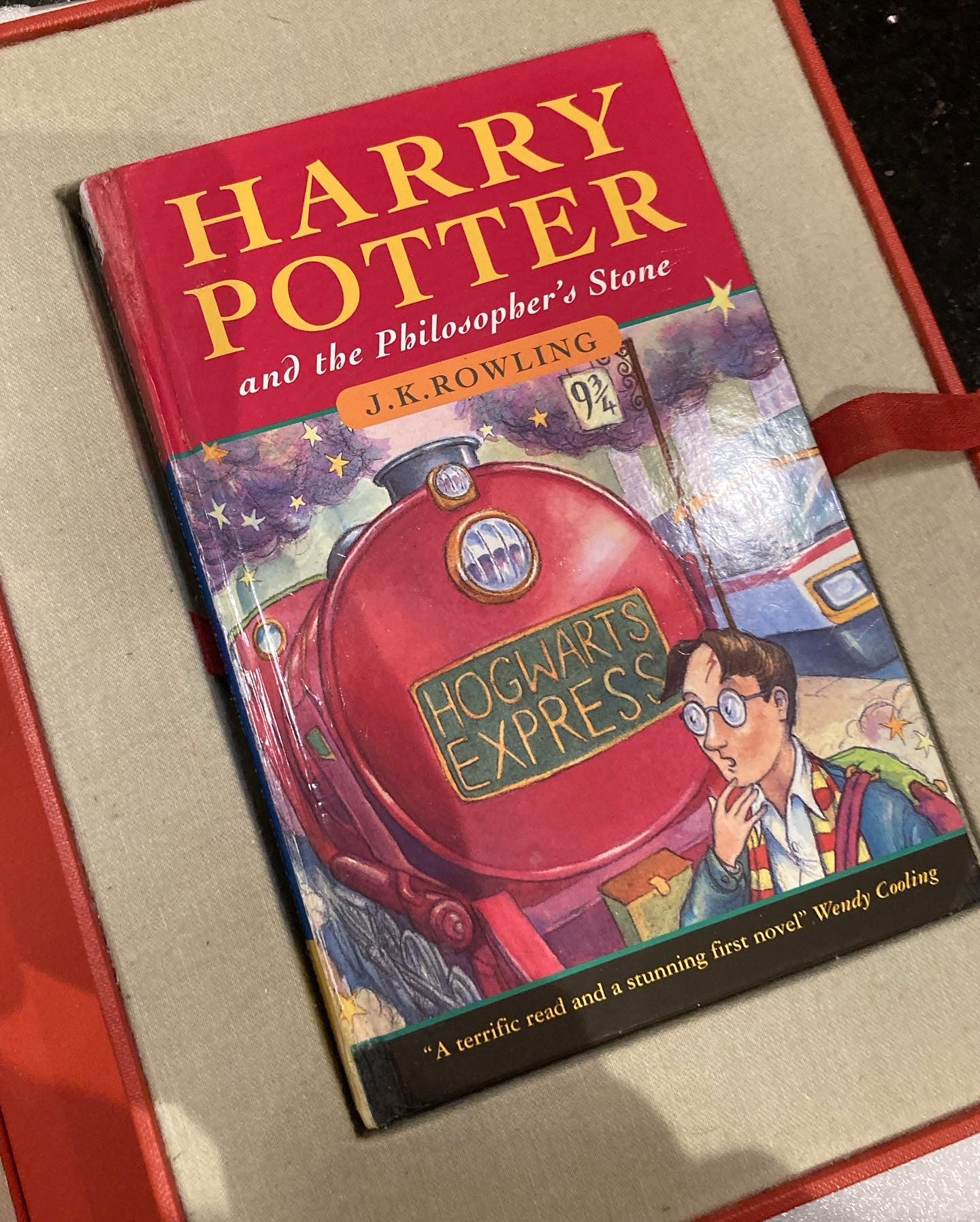 First edition, first impression with all the requisite first issue points: Printing number line: 10 9 8 7 6 5 4 3 2 1; Wendy Cooling blurb to the front board; 'wand' appears twice on page 53; 'Philosopher's' is mis-spelt 'Philospher's' to the back board and; 'Wizardry and Witchcraft' [rather than Witchcraft and Wizardry'] to the back board; Joanne Rowling" for "J.K. Rowling", and lastly and "Thomas Taylor1997" (lacking the space) on the copyright page.