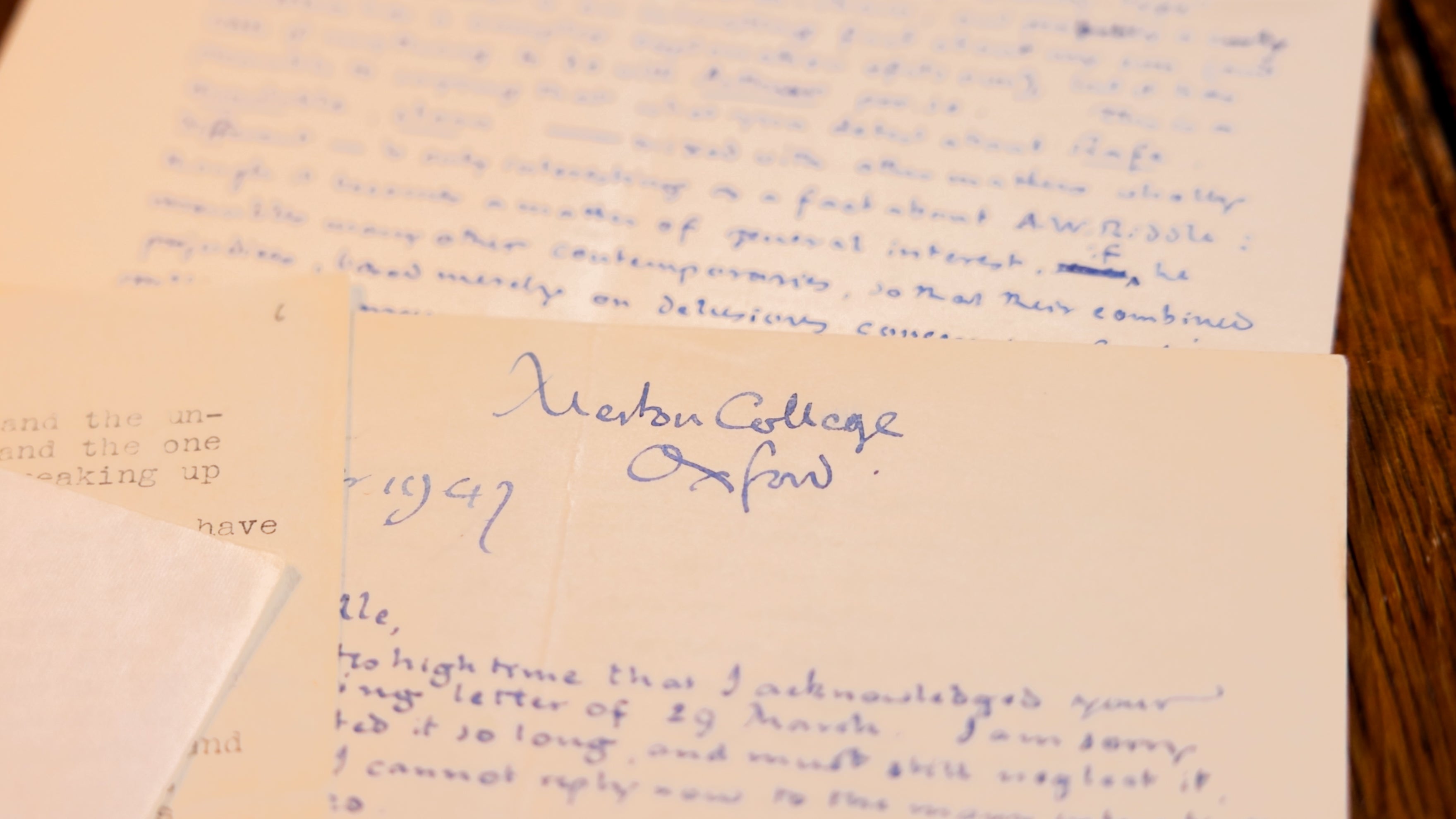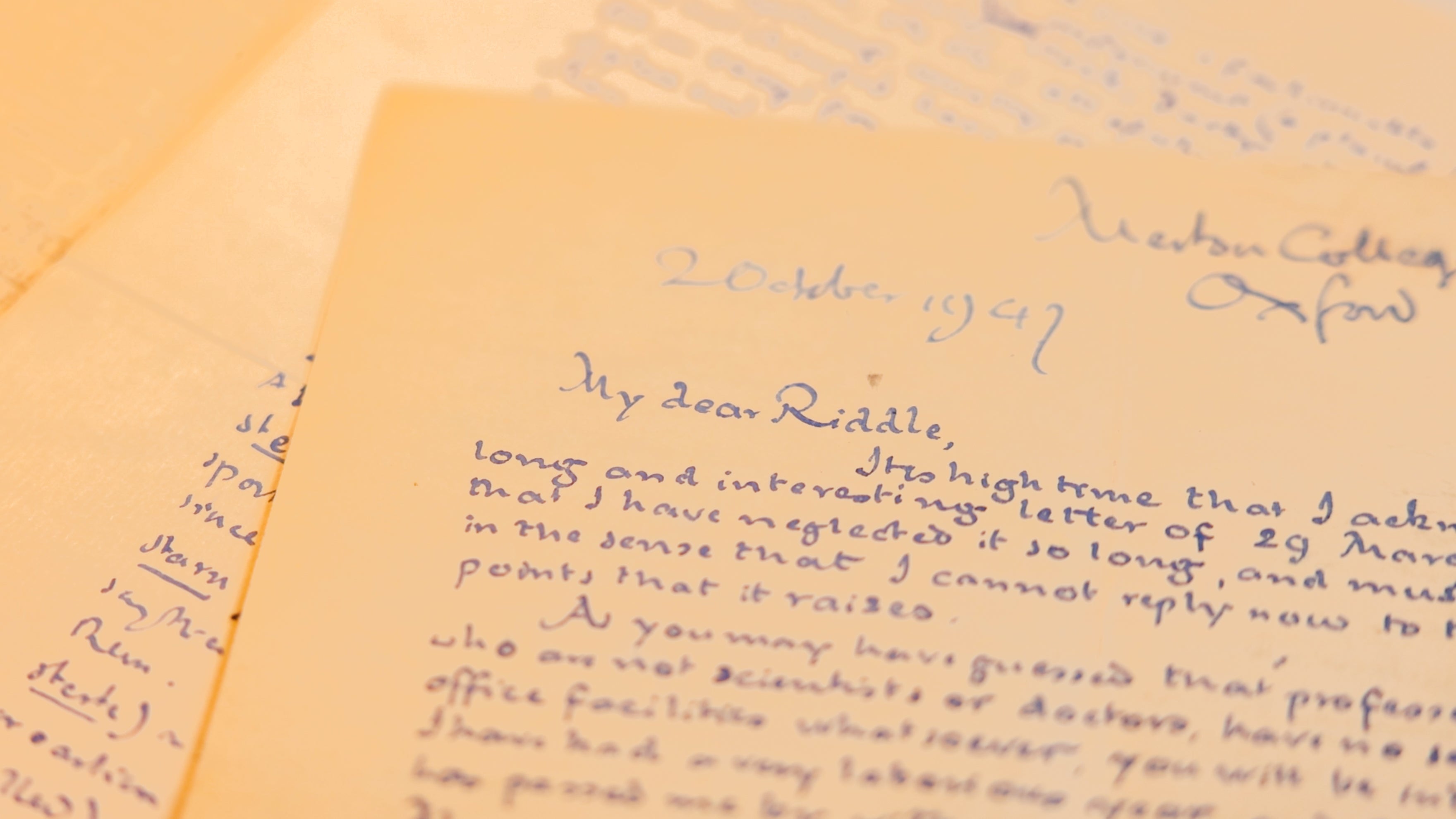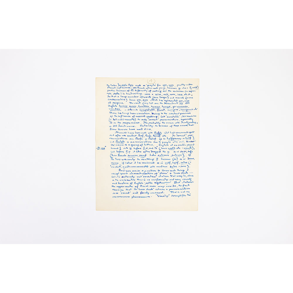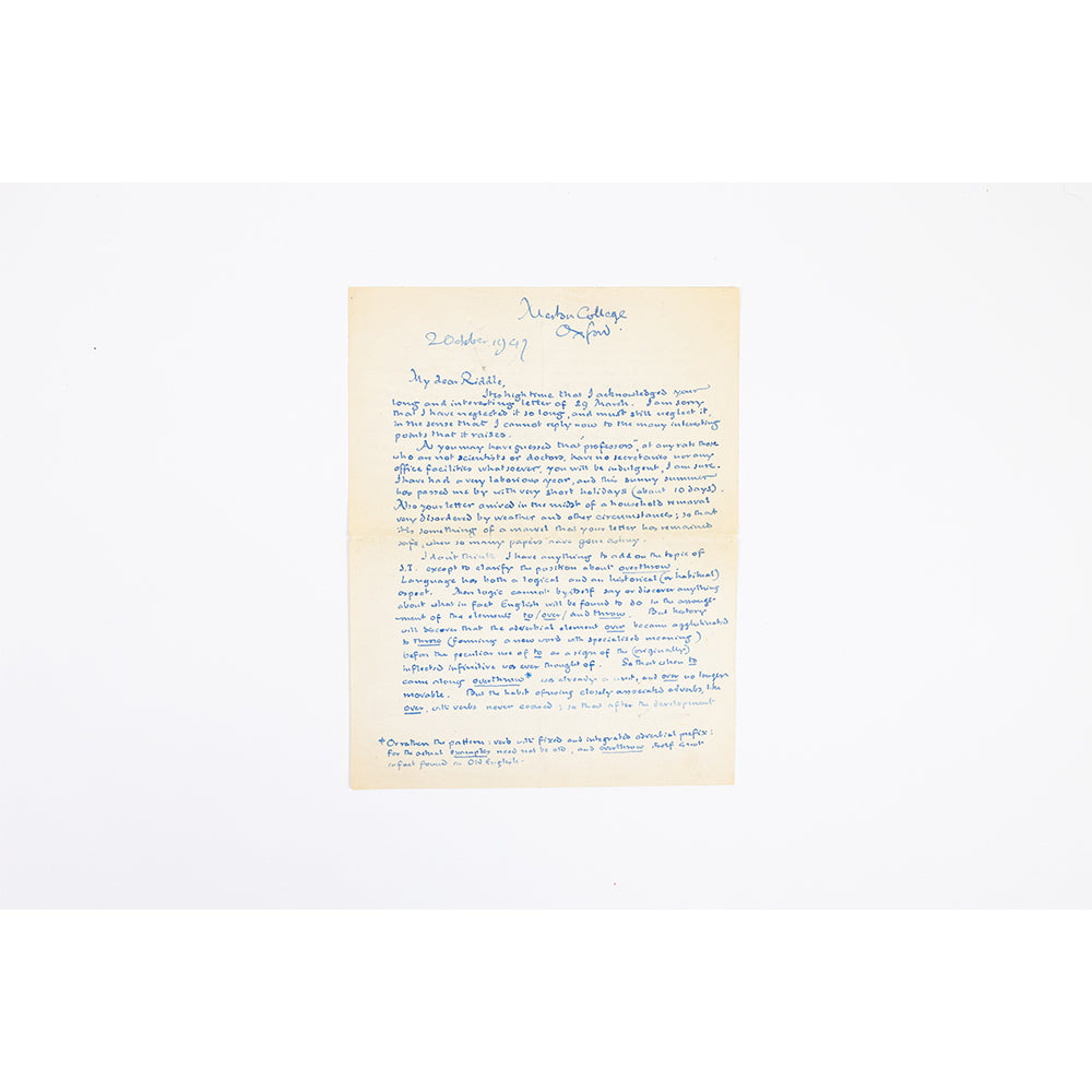Handwritten, signed letter dated 2nd October 1947 and headed Merton College, Oxford. Tolkien's theories on languages, prejudices that can arise from names and a lovely Tolkien family reference to his son and to his father. 6 pages.