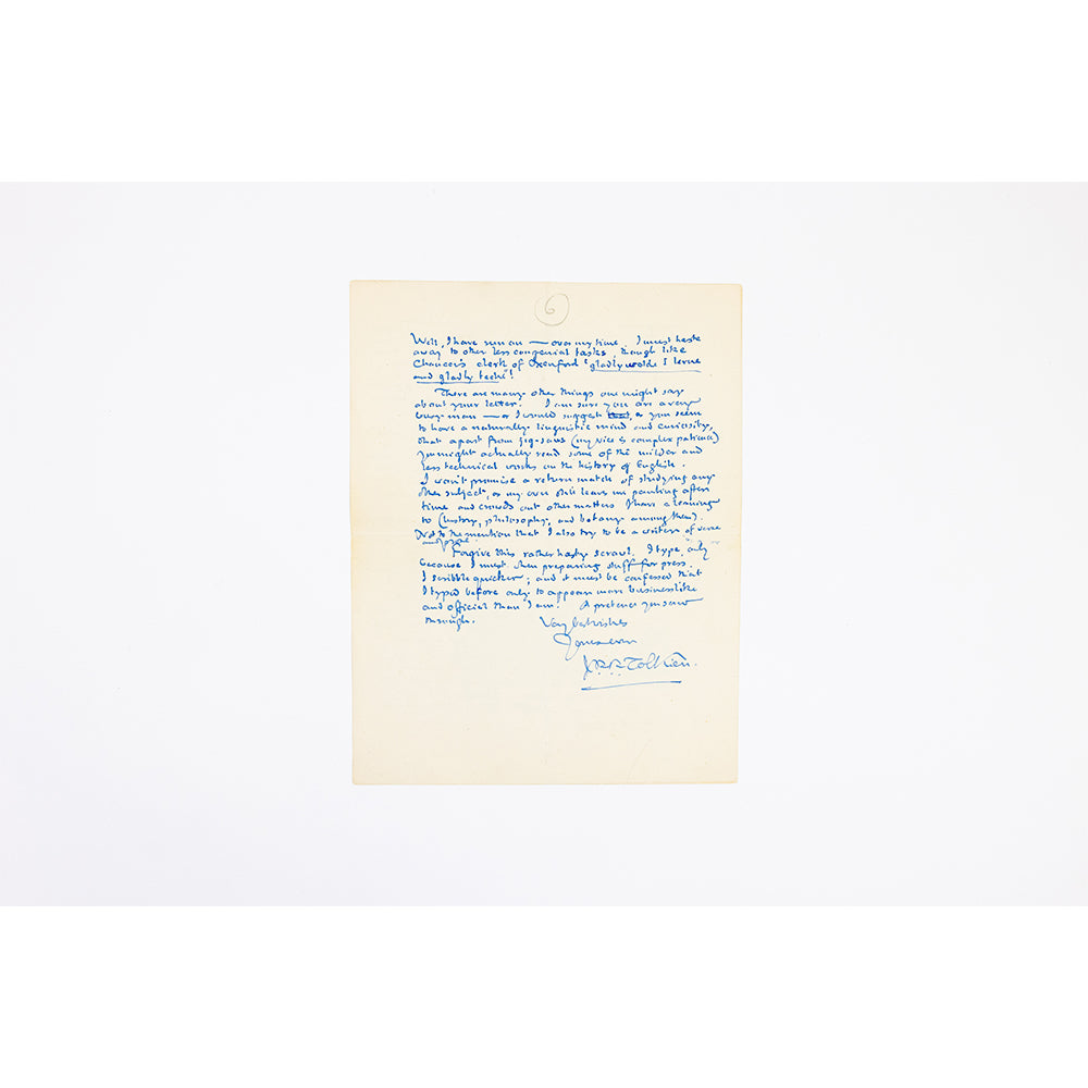 A singularly important letter in Tolkien's amazing, rather elvish handwriting, with one of the great Tolkien languages quotes: 'Languages remain.... the property of ordinary men....'