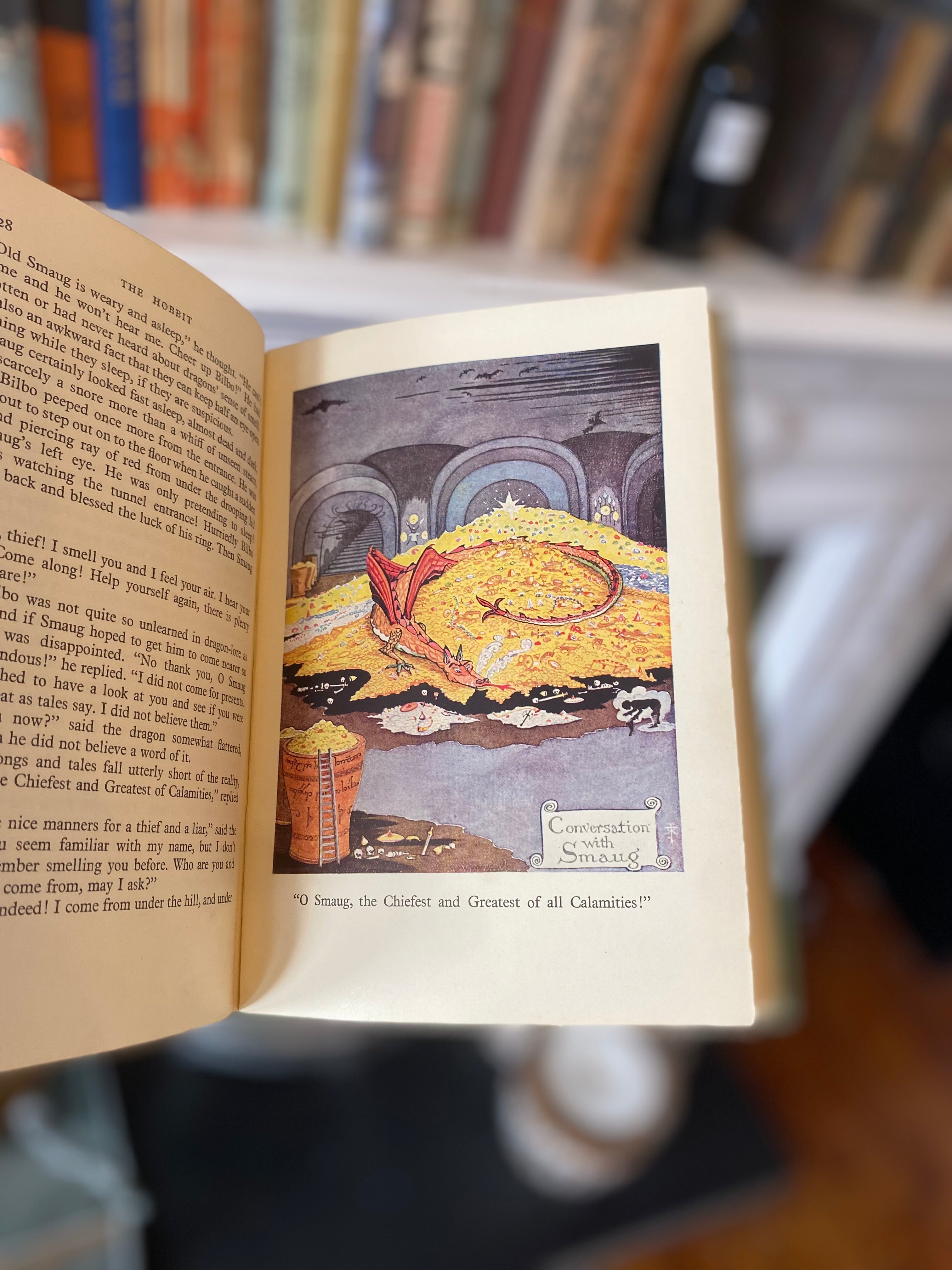 Published in the same year as the first impression, this first colour illustrated edition (second impression overall) is the first time the world saw Middle-Earth in colour. This impression was printed in December of 1937 in an edition of 2300 copies (423 of which were destroyed at the warehouse of the binder, Key and Whiting, in the bombing of London on November 7th 1940). This example, with the connection to the Tolkien family, is one of a kind and has been held in the consignee's family by descent since 1938. One does presume that the book was originally given to his uncle by Tolkien himself.
