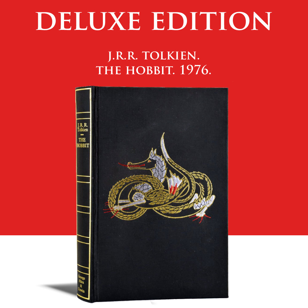 First deluxe edition, first impression. Publisher's original black pictorial cloth with illustrative vignette of Smaug. With the original black slipcase. Both in near-fine condition. With the original 12 colour plates, and 2 double page colour maps, all by Tolkien.