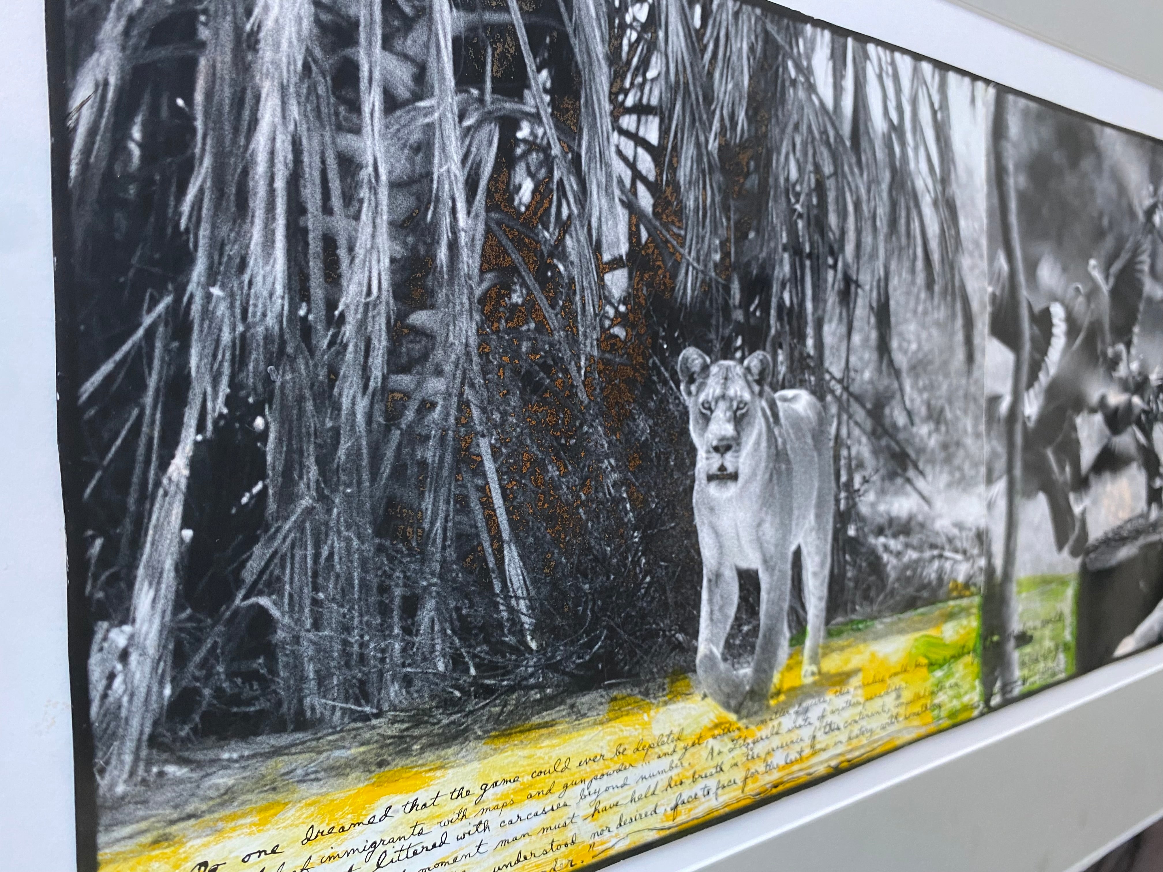 Peter Beard (1938 – 2020) was an American artist, photographer, and writer known for his distinctive style blending photography and collage, capturing the essence of African wildlife and culture. Born on January 22, 1938, in New York City, Beard developed a fascination with nature and wildlife early on, which would shape his artistic endeavours. He studied art history at Yale University, where he began experimenting with photography, focusing on documenting the raw beauty of African landscapes and wildlife during his travels.