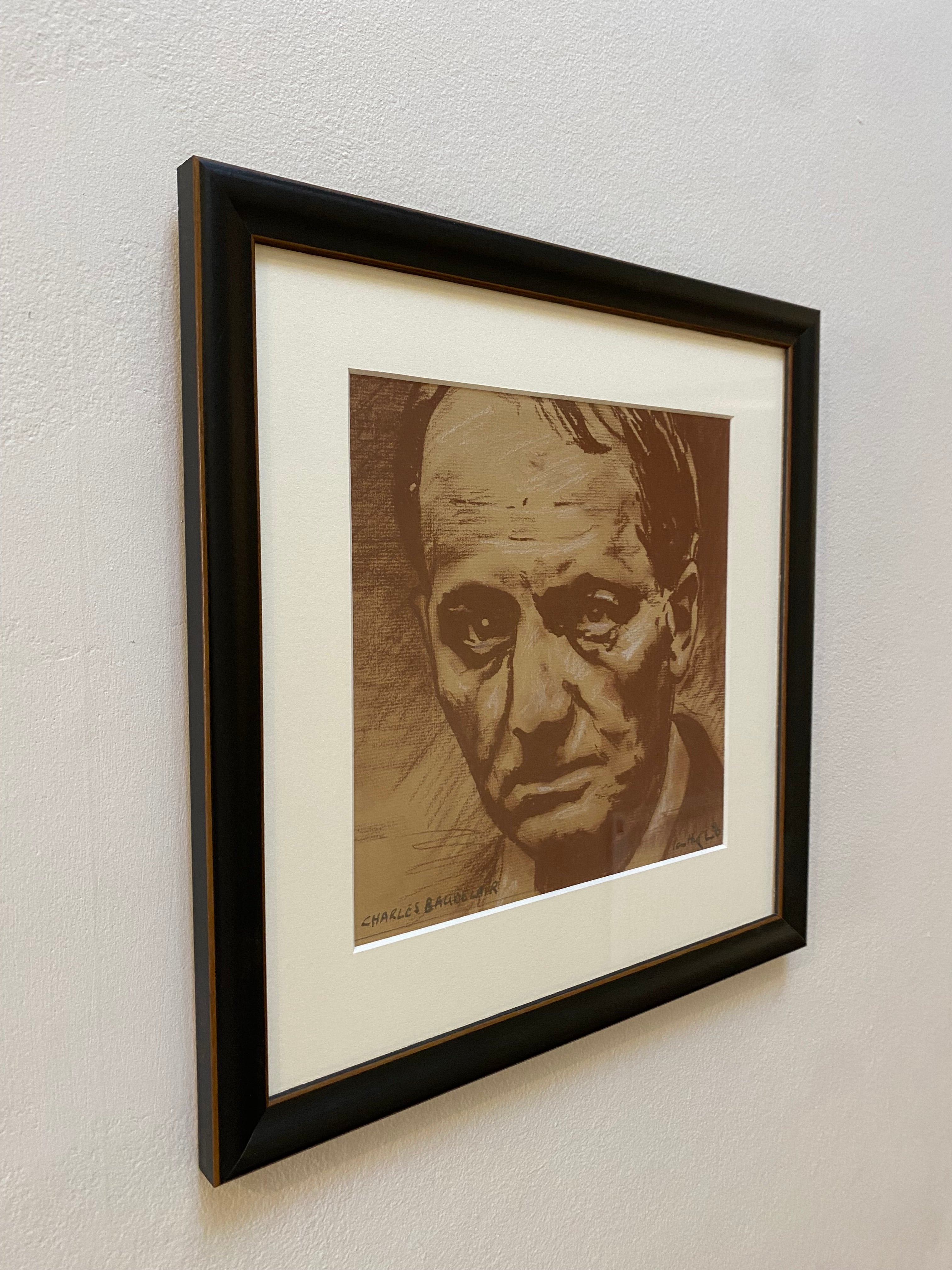 Etienne Carjat's 1858 photograph of the French poet is the basis for Hughes' interpretation, defined by a severe mouth, immoderate brow, and two drops of coffee-like eyes. Carjat, a renowned caricaturist, is remembered for his striking portraits of the political and artistic figures in 1860 Paris. This piece has been framed and glazed to gallery standards.