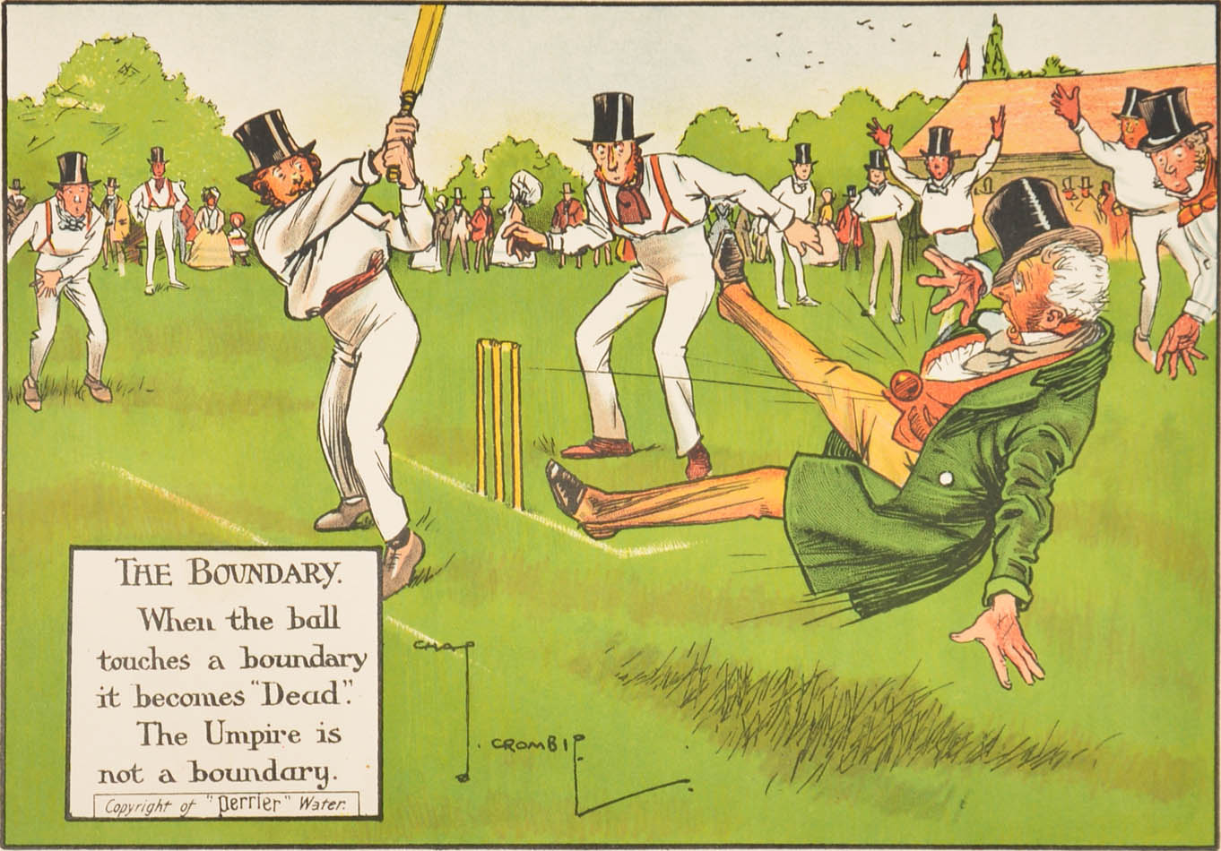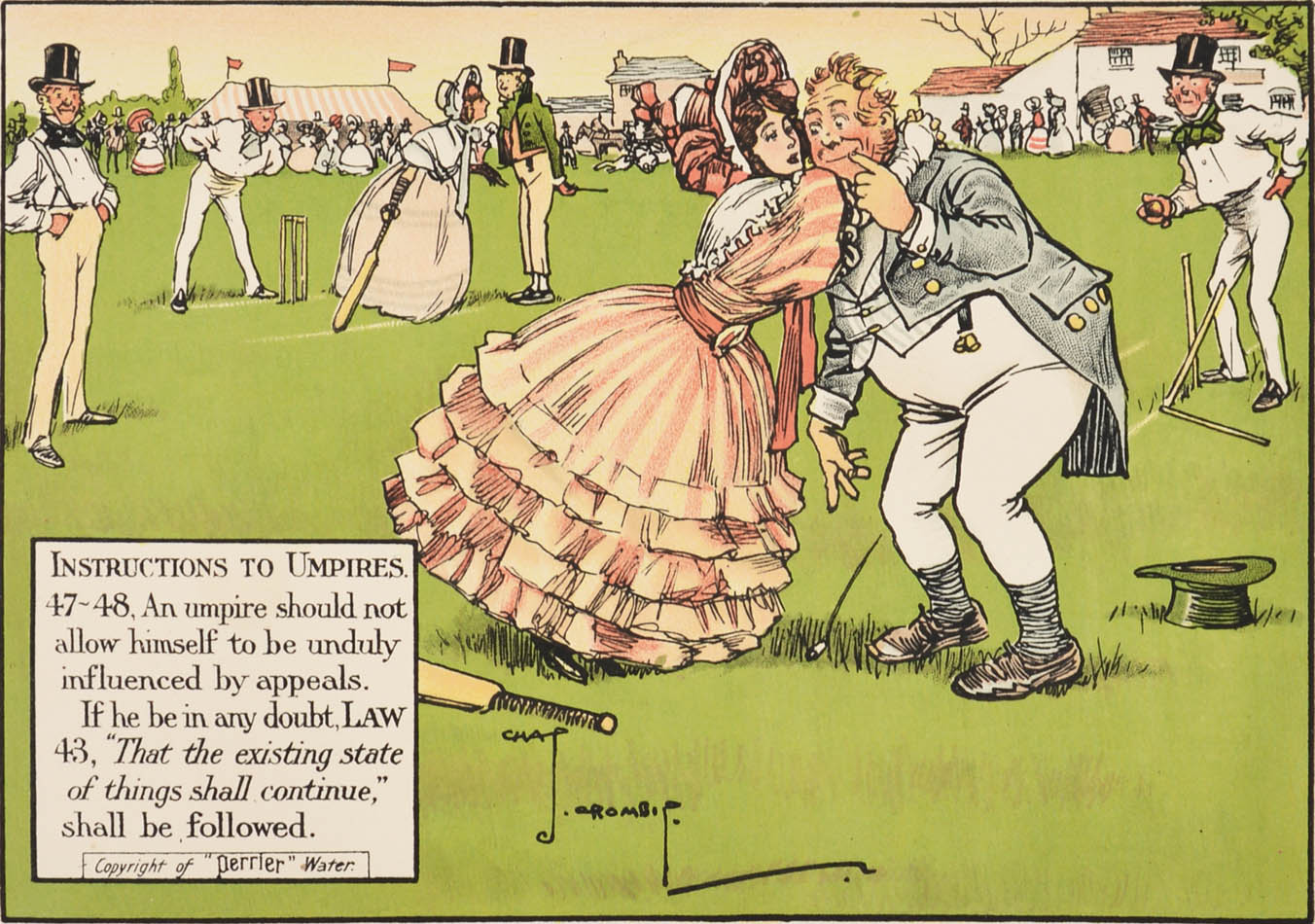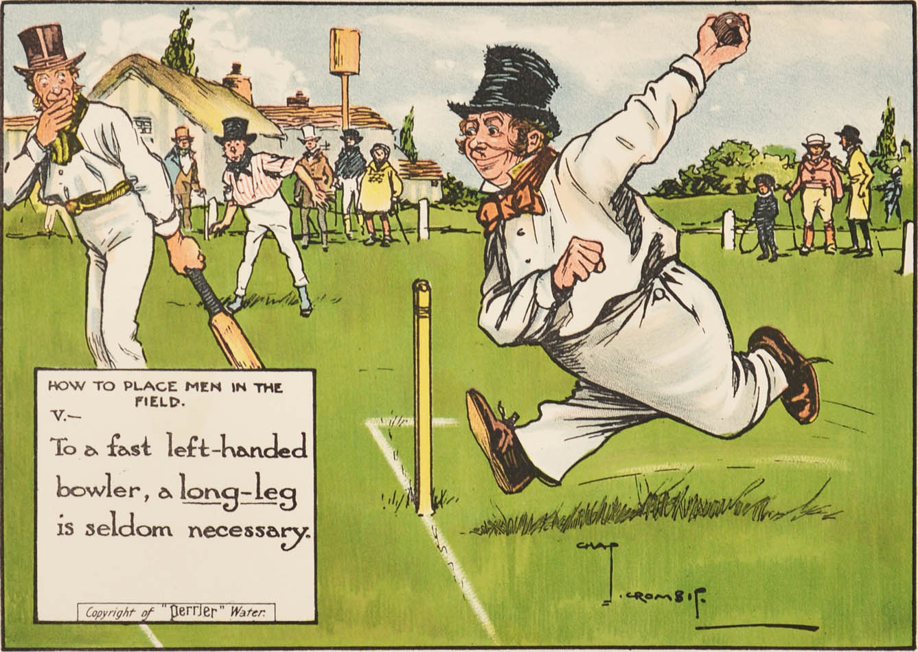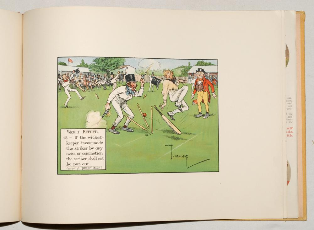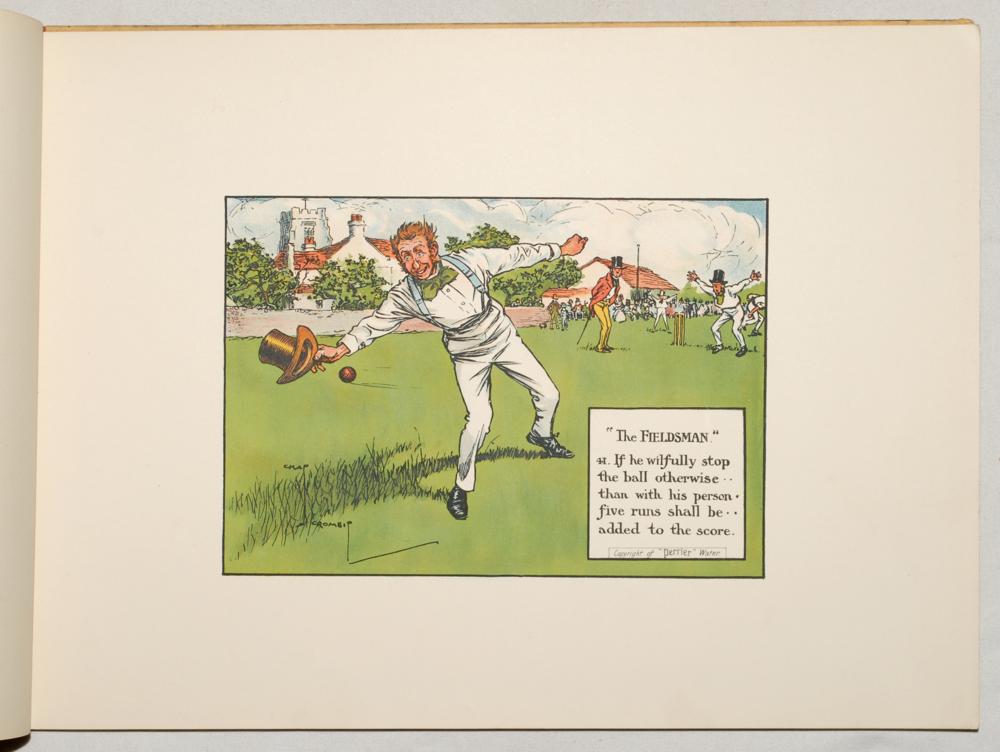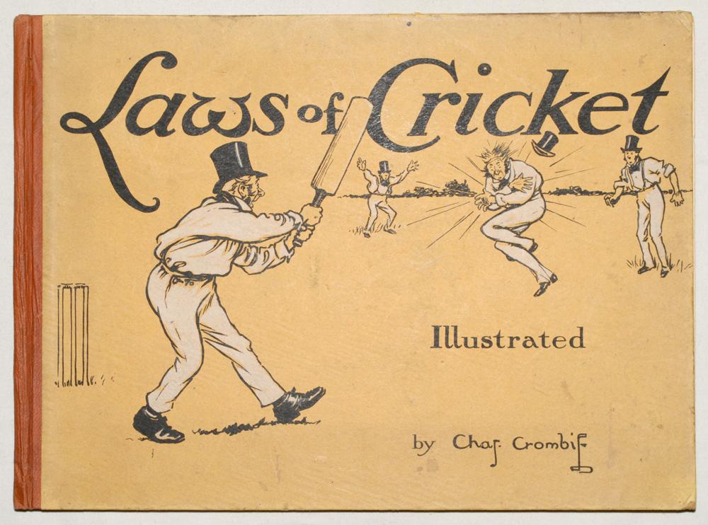 This first and only edition of Laws of Cricket, with its collection of humorous illustrations depicting scenes of cricket by cartoonist Charles Crombie, is a highly sought-after masterpiece. Remarkably, it's rare to come across a complete set in its original pictorial boards; many copies have been split and the illustrations framed instead. Published by Perrier Water with their copyright and logo at the verso of each page, this edition by Crombie - famed for his 'The Rules of Golf' editorial cartoons first released through Perrier in 1906 - is a truly magnificent find in such condition.