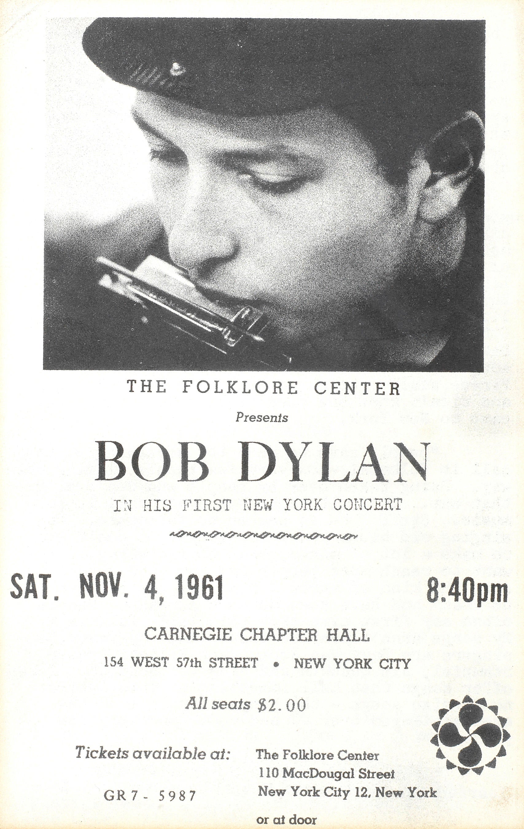 Billed as Dylan’s “First New York Concert” it was, more accurately his first concert anywhere. Prior to this show he’d only played club dates and a few guest spots on multi-artist bills.