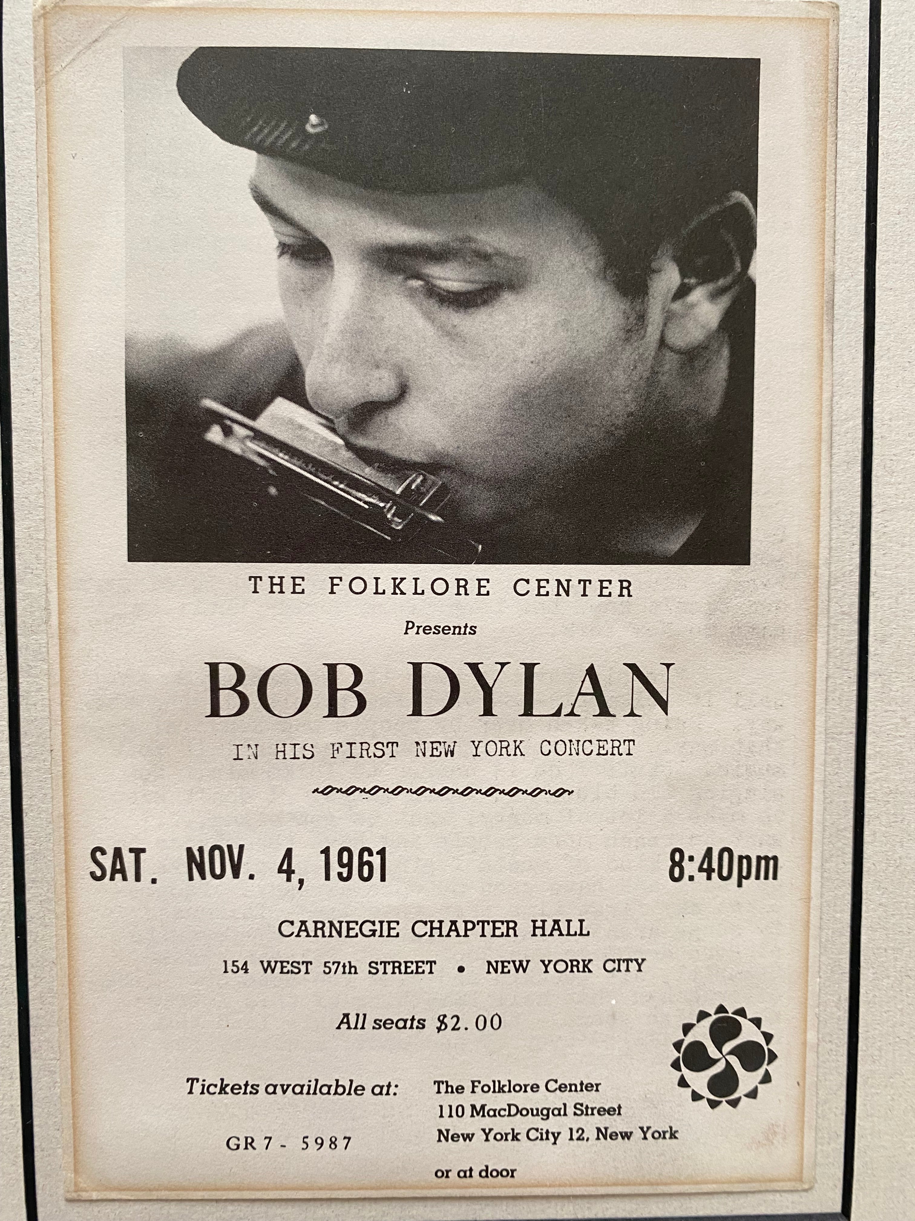 A rare and iconic piece of music memorabilia: the original handbill used to advertise Dylan’s first-ever headline concert on November 4, 1961.