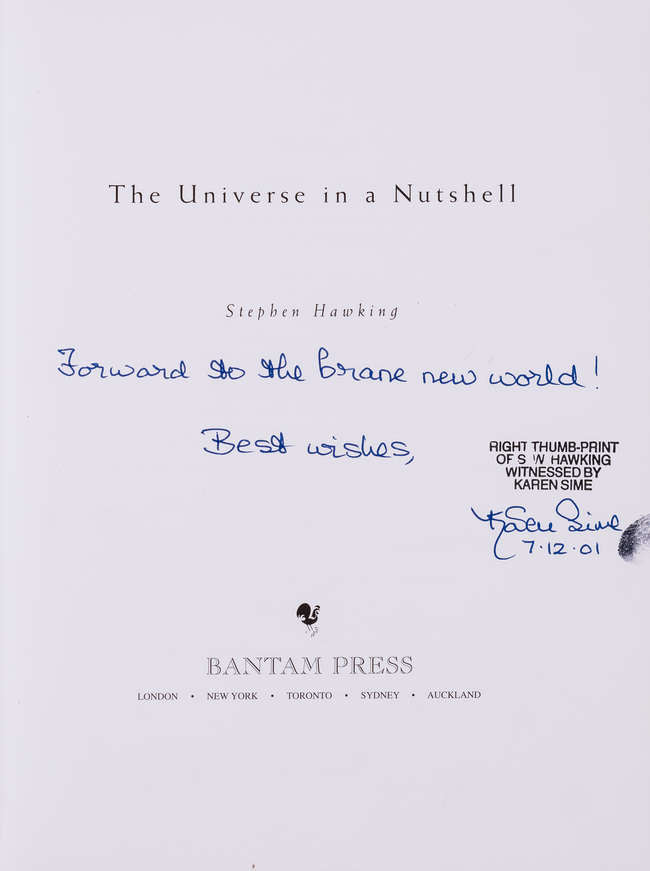 Signed by the Stephen Hawking with thumb-print, additionally inscribed and signed by Karen Sime (Hawking's Personal Assistant) "Forward to the brave new world!" and with ink stamp "Right thumb-print of S W Hawking witnessed by Karen Sime" above her signature and date "7.12.01".