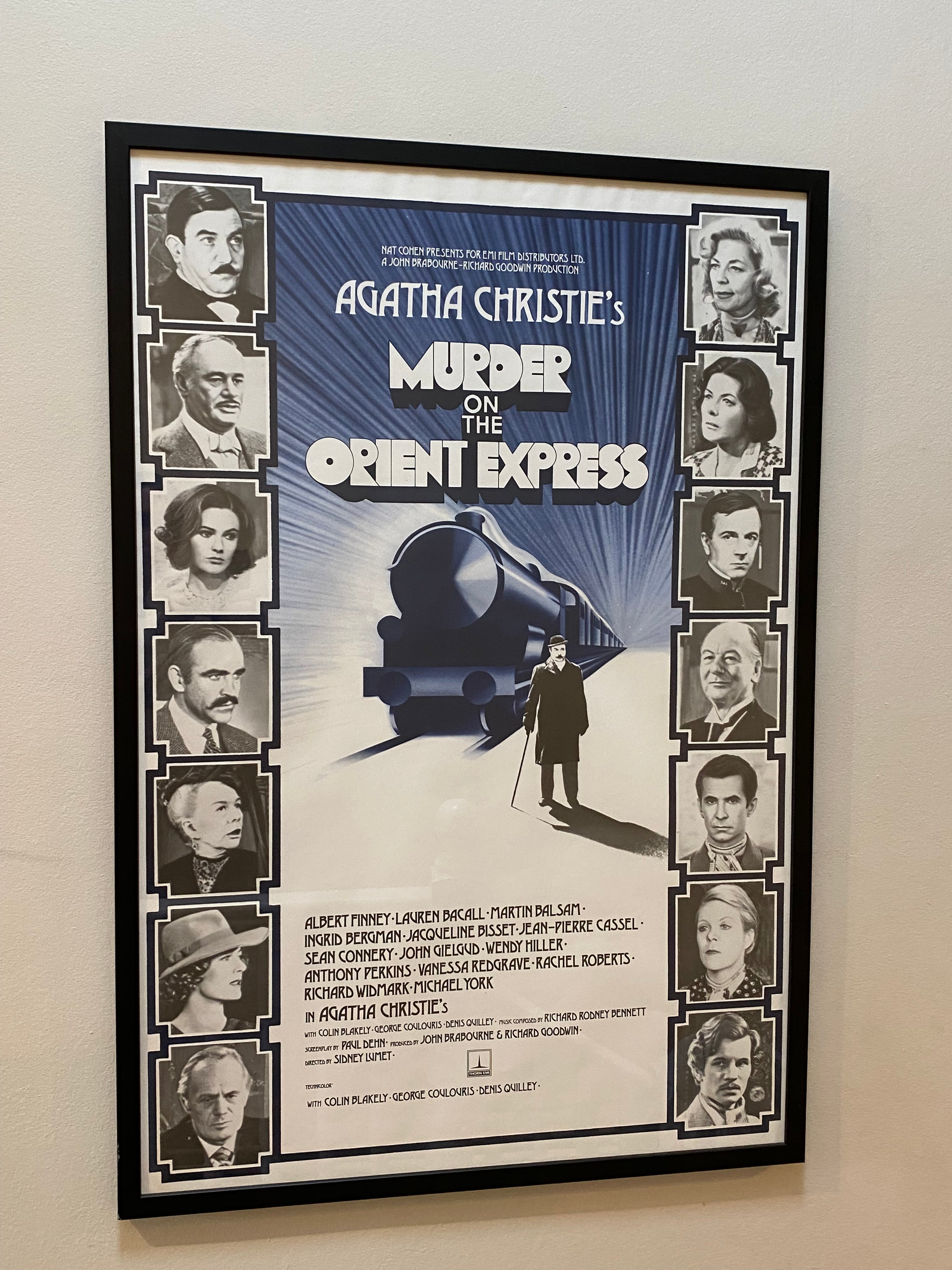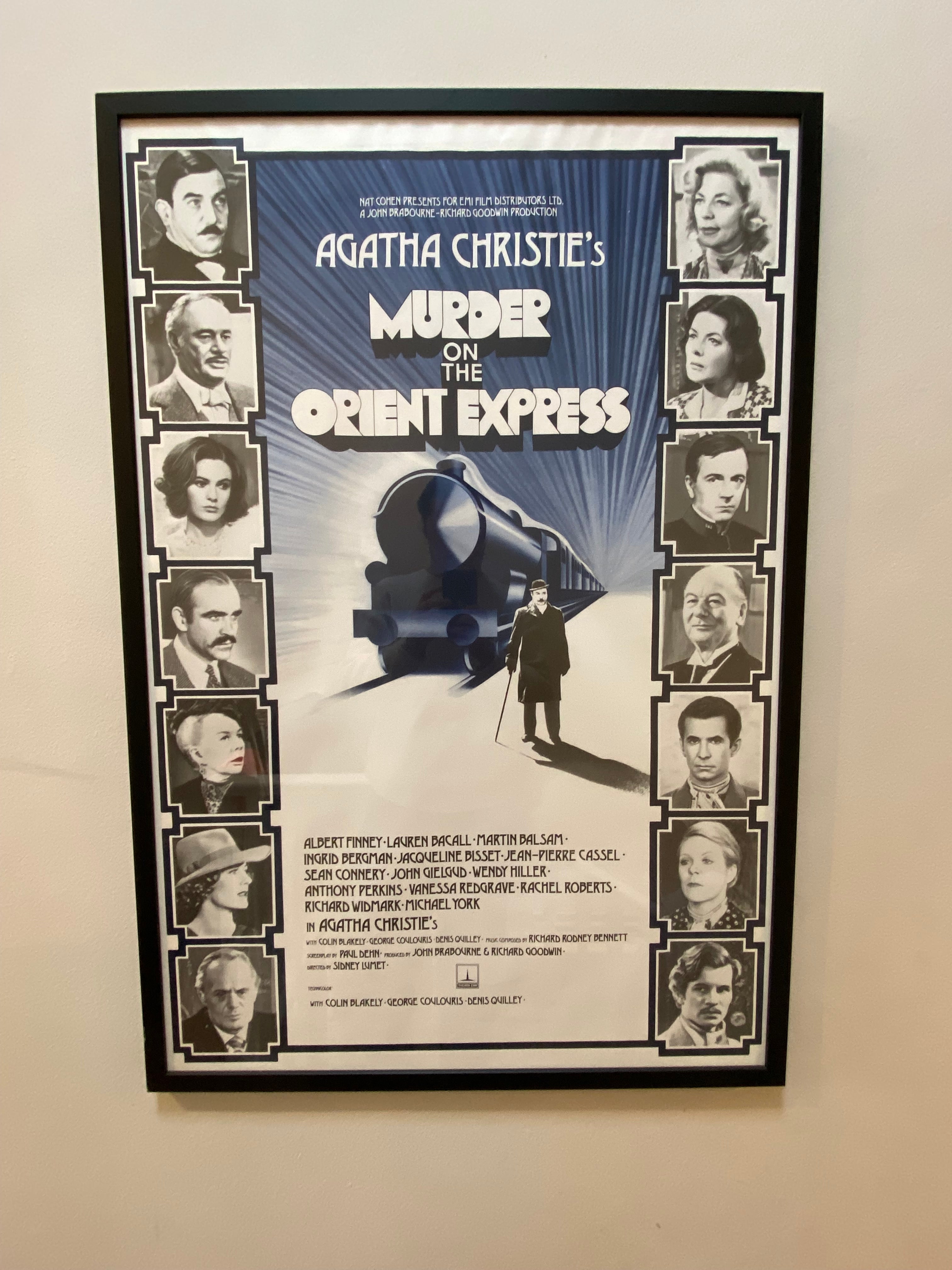The original UK movie poster for the classic 1974 production of Agatha Christie's iconic Murder on the Orient Express with a wonderful art-deco design