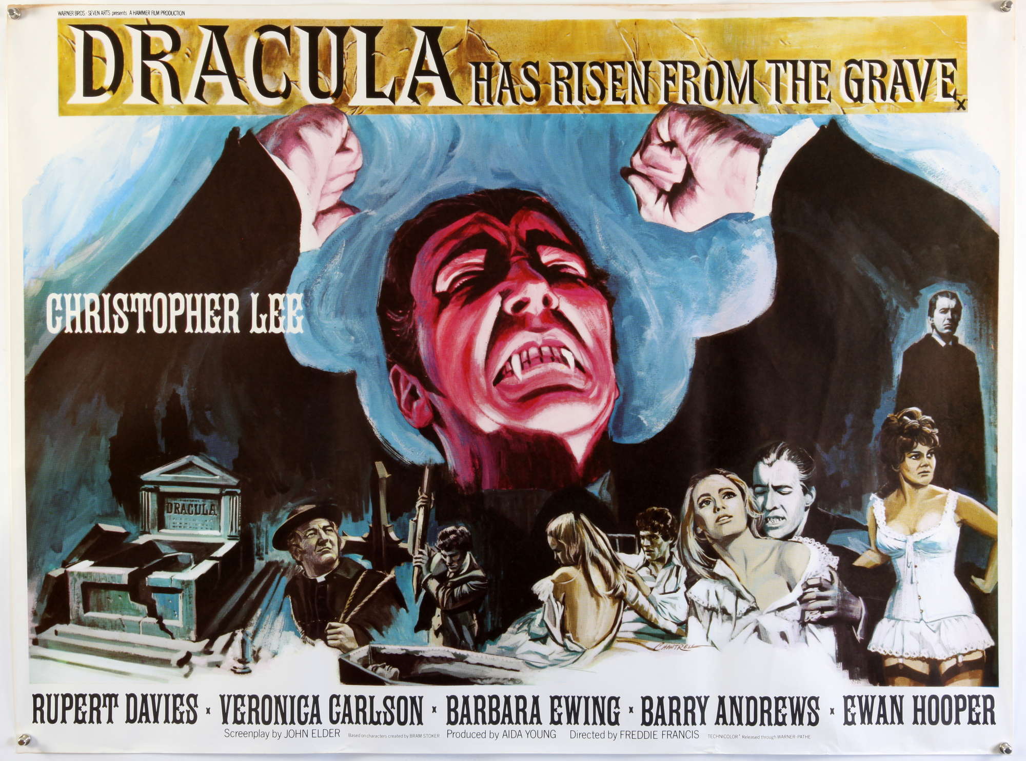 The original, British quad theatrical movie poster from 1968 for Dracula Has Risen From the Grave starring Christopher Lee. The artwork was designed by Tom Chantrell.