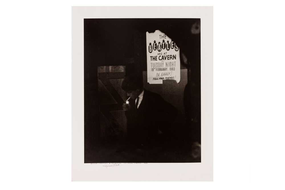 George Harrison lighting up outside The Cavern Club | 1963, silver gelatin print, signed, titled, dated, by the photographer, framed.