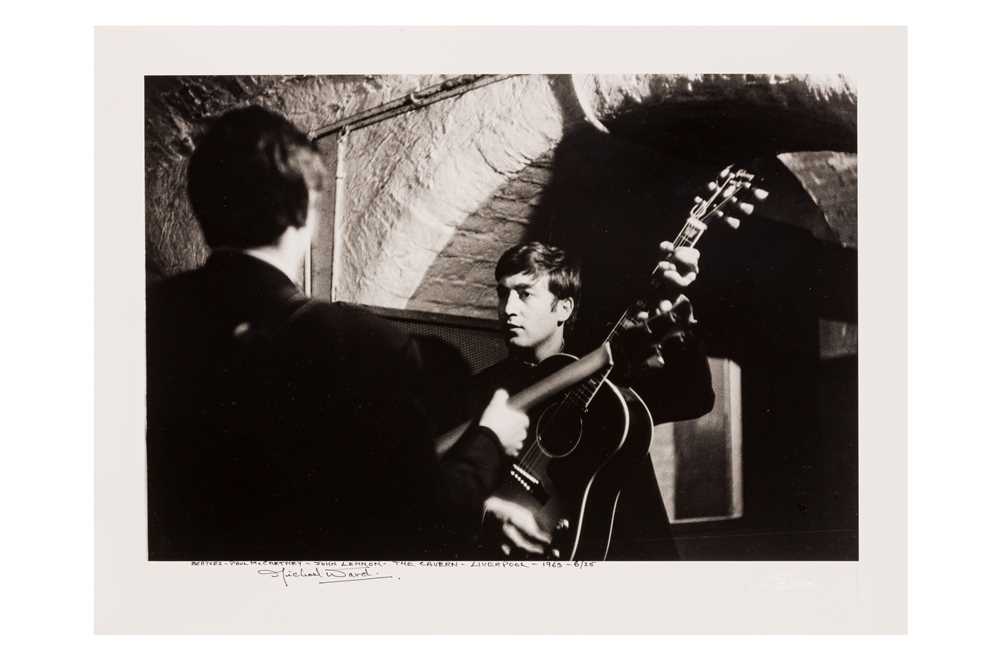 John Lennon and George Harrison rehearsing before their final show at The Cavern Club | 1963, silver gelatin print, signed, titled, dated, by the photographer, framed.