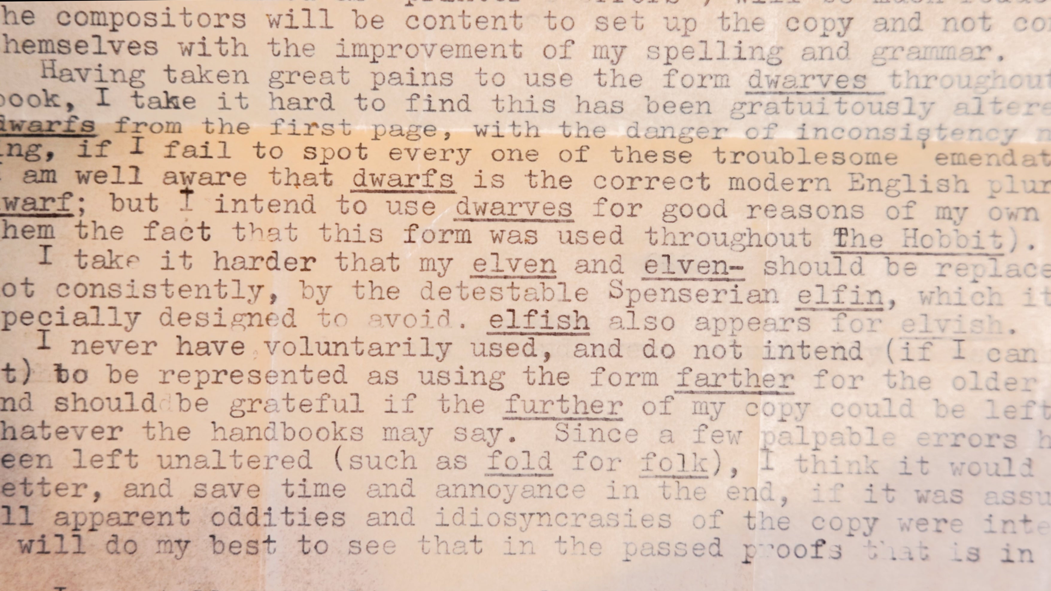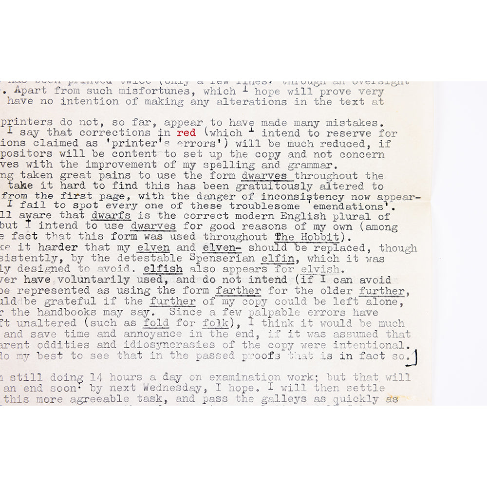 One of the most sought-after Tolkien letters and now rather infamous. A disgruntled Tolkien is found in this letter to his publishers. After receiving the pre-publication Galley proofs of Lord of The Rings, the editors have updated the spelling throughout the book of particular words like Dwarves, Elven, Elvish. As we know, Tolkien was a fastidious student of languages and took great pains to consider the spellings of each word.