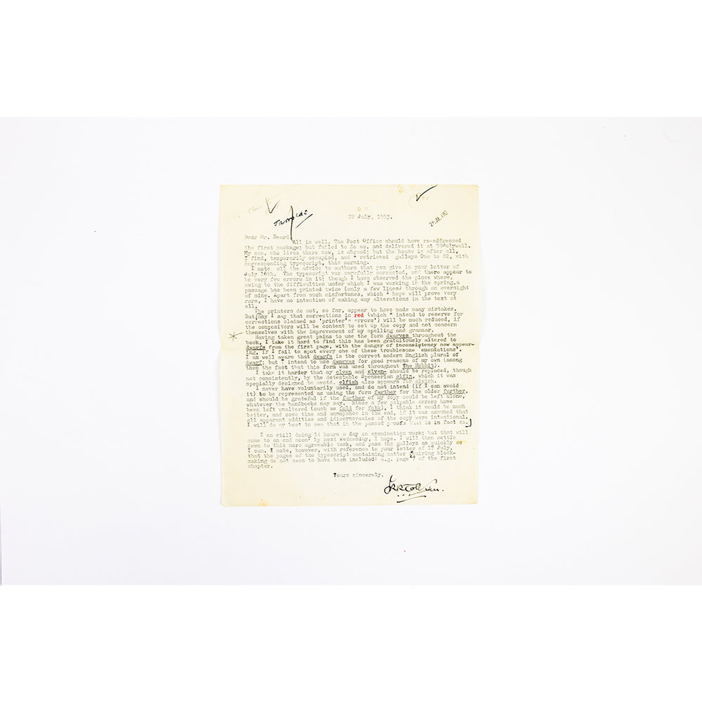 The famous Galley Proof ‘snorter’ letter | 24th July 1953, original Tolkien letter to his publishers Allen & Unwin, typed, hand annotated & signed.