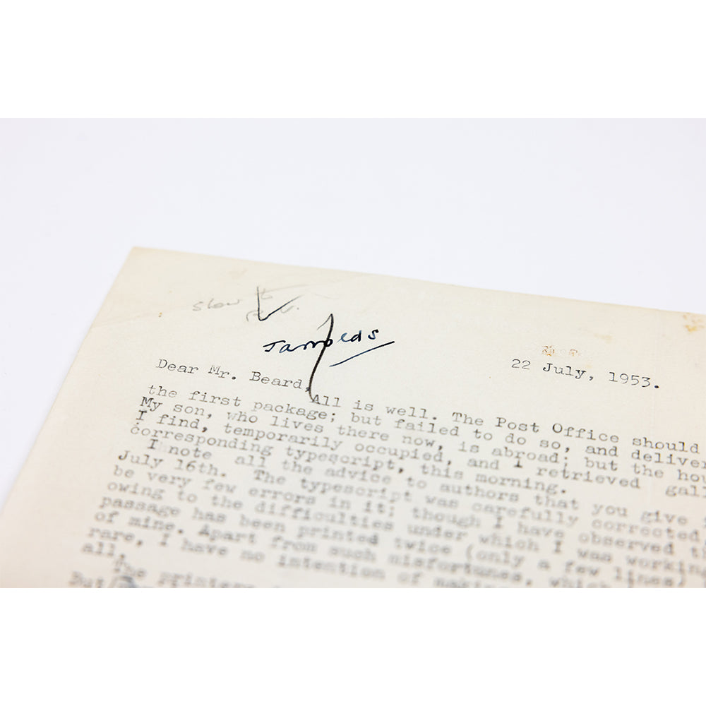 Typed, signed letter to Tolkien's publishers dated 24th July, 1953, regarding the galley proofs of Lord of The Rings and rebuking his publishers. 1page.