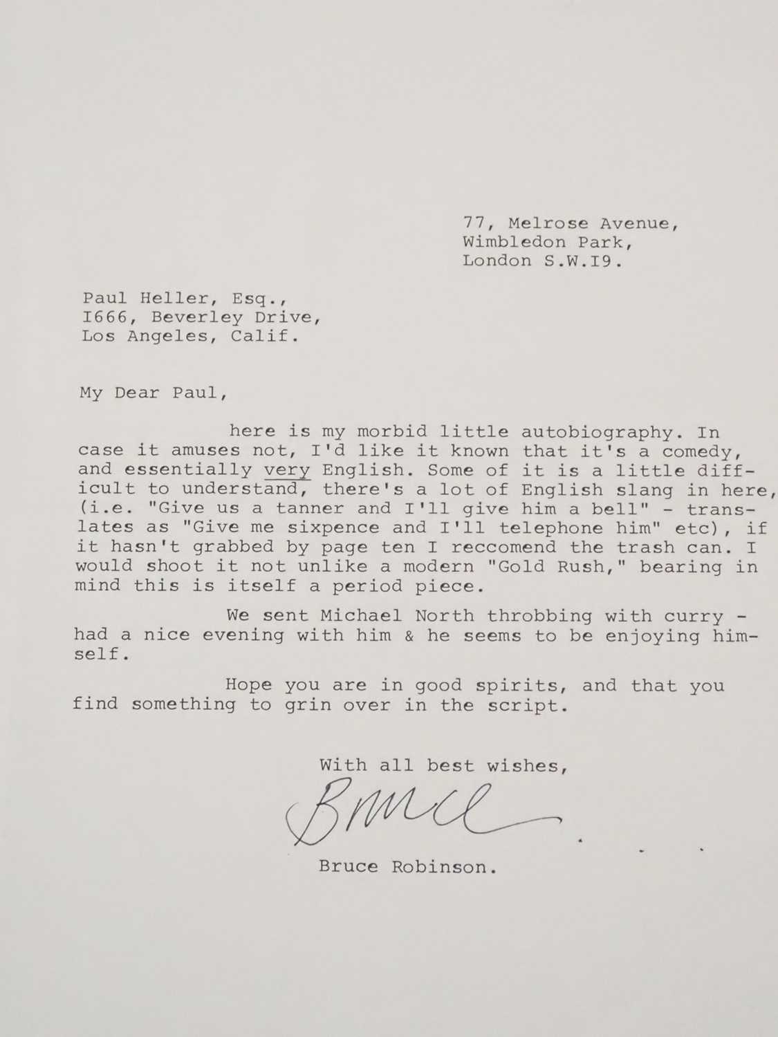This original first draft of Withnail and I was sent to the renowned Hollywood producer Paul Heller by the director and screenwriter Bruce Robinson in an attempt to entice him to make the movie. This strategy proved successful and the film was made with Heller as producer.